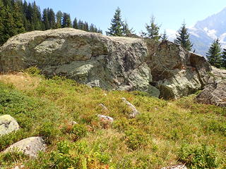 道は開けた斜面を横断し、一時的に崖に切られた際どい道を通過してボルダーが点在する広場を通過します。