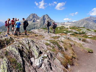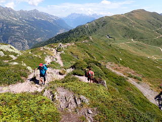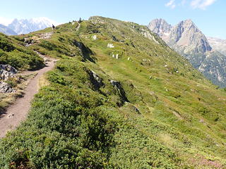 上のテレキャビン駅からしばし歩いたところにある鞍部Col des Posettesで道は左後方のバルム峠方面と右前方のエギュイエット・デ・ポゼットAiguillettes des Posettes方面とに分かれます。この時点ですでに前方にはモン・ブランから手前へ連なる白銀の山々が見通せていて、テンションが上がってきます。
