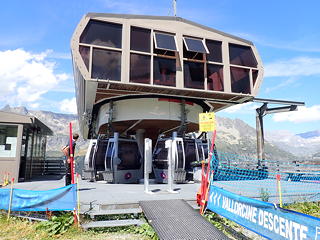 ……などと考えているうちにトンネルを抜けた列車は、やがてヴァロルシーネの駅に到着しました。駅の外に出るとすぐそこがテレキャビンのステーションで、ここはもちろんマルチパスでフリー。テレキャビンは標高差700m余りを一気に稼いでくれました。