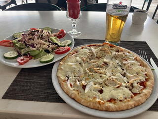 シャモニー駅に戻り着いてまっすぐ向かったのは、過去何回かのシャモニー訪問でなじみになった「金龍」です。ここは中華料理とピザレストランの二つの顔を持ち、もっぱら後者で利用してきた店ですが、今回もまずはビール、ついでサラダとピザを注文しました。特に生野菜に飢えている身の自分にとって、ここの山盛りサラダは貴重。もっともピザ1枚はさすがにもて余した(しかし完食した)ので、次にここに来るときはサラダとビールだけを注文することにしようと思います。