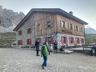 4時半にホテルのロビーに降りると、早出する我々のためにテーブル上にパンとコーヒーのポットが置かれており、そそくさと朝食をすませて出発して車で20分もかからずに起点となるRifugio Auronzo近くの駐車スペースに到着しました。