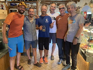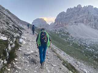ついによく整備された登山道(トポに「Approach to Cima Grande West Face」とある道)に行き当たって緊張が解かれ、ここで先ほどから行き先を教えてくれていたローカルガイドや別ルートから降りてきていたらしい別のローカルガイドと合流しました。イタリア人ガイドが3人寄るとかしましい……という諺はないと思いますが、実際には3人のイタリア人がしきりに足を止めてはおしゃべりをするのでこちらは辟易。それというのもこの猛暑のために朝Refugio Lavaredoで調達した水がずいぶん前からなくなっていたからで、やっとRifugio Auronzoに降り着いたときには真っ先にコカコーラを買い求めました。
