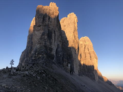 ドロミテを代表する岩峰のひとつトレ・チーメTre Cime di Lavaredo(ドイツ語名「ドライ・チンネンDrei Zinnen」)はその名のとおり三つの岩峰の集合体で、Rifugio Auronzoに近い方(西側)から東に向かって順にCima Ovest、Cima Grande、Cima Piccolaですが、Cima PiccolaはさらにPunta FridaとCima Piccolissimaを加えた三つの岩峰の集合になっているというちょっと複雑な形状で、これらのいずれにも多くのクライミングルートが設定されています。