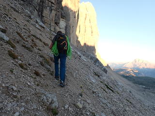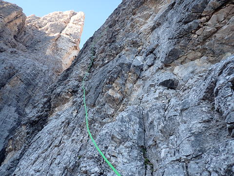 手前から2番目の岩峰が主峰チマ・グランデで、その右側の垂直の壁はガストン・レビュファの『星と嵐』でも取り上げられたチマ・グランデ北壁です。今日登る「Spigolo Dibona」は初登が1909年、この北壁と手前の東壁の境目をなす北東稜近くからスタートし、基本的には東壁の中を北東稜から離れないようにして頂上手前の環状テラスまでを13ピッチで登るものです。こうして見るとスケール感が伝わりませんが、あの北壁は高距500mほどもあり、山頂の標高は2999mです。ドロミテの岩峰前半に言えることですが、ルートの長さも標高の高さも見た目に騙されると痛い目をみることになります。