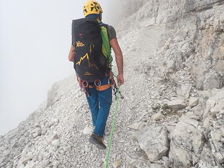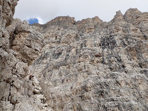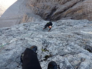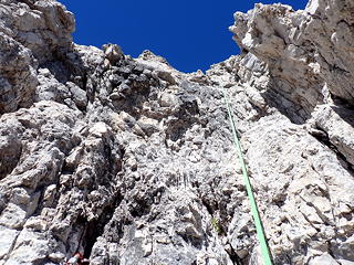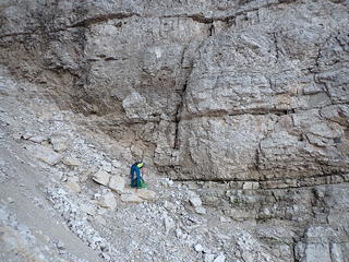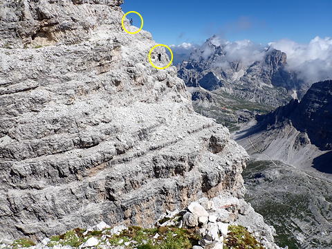 環状テラスの途中から振り返った「Spigolo Dibona」の最終ピッチ。途中で抜かさせてくれたローカルガイドパーティーと、その足元の斜面の脆さがはっきり映っています。そして上で確保しているローカルガイドの立っている位置に水平に続いているのが環状テラスです。