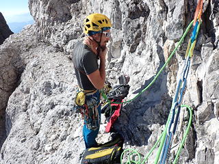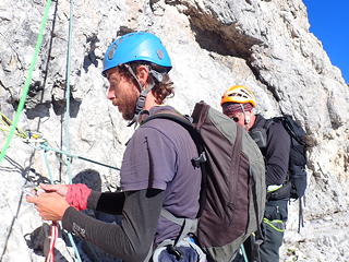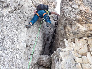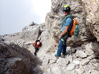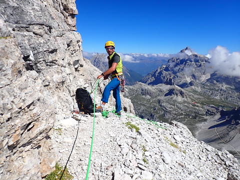 環状テラスまでの下降の途中でまずローカルガイドパーティー、ついでカタルーニャパーティーとすれ違い、お互いの健闘と無事を讃え合いました。後は懸垂下降やクライムダウンを織り交ぜてCima GrandeとCima Piccolaの間のルンゼに入っていくはずだったのですが……。