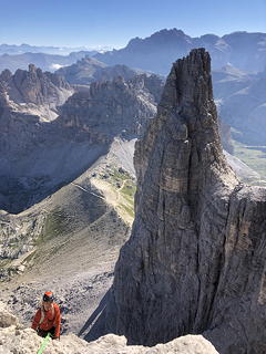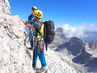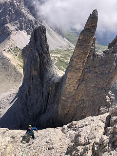 残置ピンが見当たらないところではカムやナッツも駆使して支点を構築しつつピッチを重ねて行くうちに、背後のCima Piccolaは眼下に遠くなっていきます。