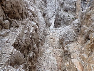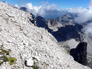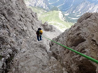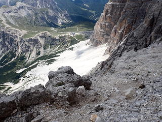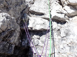 その助言に従って少し登り返して鞍部をそれまでとは反対にCima Grandeの南面側に下り、その後は高度を少しずつ下げながらCima Grandeの南壁を西へとトラバース。そのままCima Ovestとの間のガリーに通じる湿っぽいルンゼへと入っていきました。このルートはガイドブックには書かれていませんが、踏み跡やケルンが明瞭な上に必要な場所には懸垂下降のための支点も設置されていて、下降路として確立していることが窺えました。