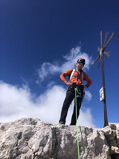 環状テラスを辿って南側に回り込み、III級程度のちょっと長い登りの末に到着した山頂には、お約束の十字架が立っていました。最後は体力的に厳しいものを感じながらではありましたが、ドロミテのシンボルと言っても良さそうなこのピークに立つことができて大満足です。