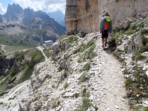 トレ・チーメの南面を水平にトラバースする道を進んで教会の前を通過し、Cima Piccolaの東側に建つRefugio Lavaredoで水を調達。さらにCima Piccolaの東からぐるっと北側に回り込んで、トレ・チーメを東から縦一列に眺める位置から一般道を離れて踏み跡を辿るようになりました。
