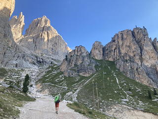アプローチの道からは、正面に2日前に奮戦したカティナッチョの壁が見えています。よくあんなところを登ったものだ……と感慨にふけりつつ、この日はその右にある岩峰群の間に通じる道へ進みます。