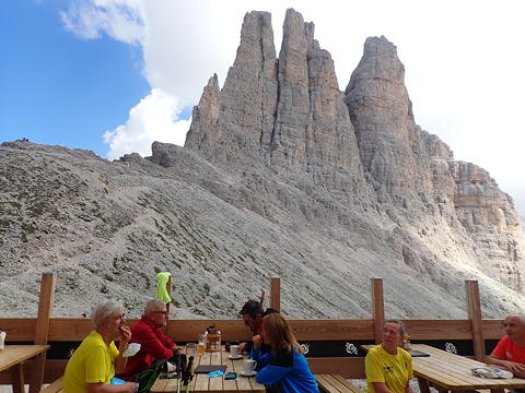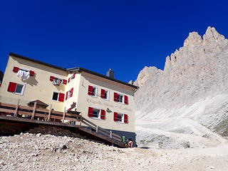 よく整備されて歩きやすい道を歩いて、まずは山懐に抱かれて雰囲気の良いRifugio Vajoletに登り着いてひと休み。