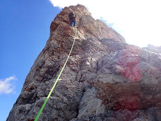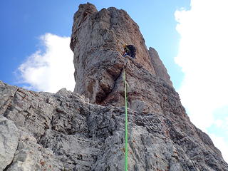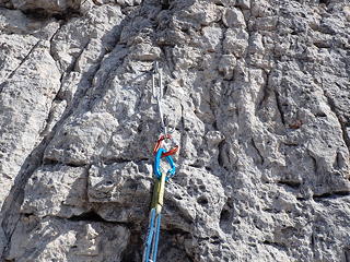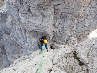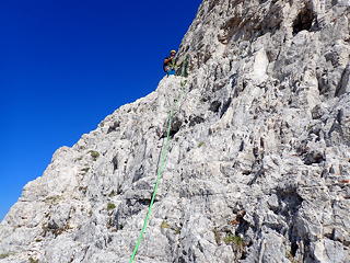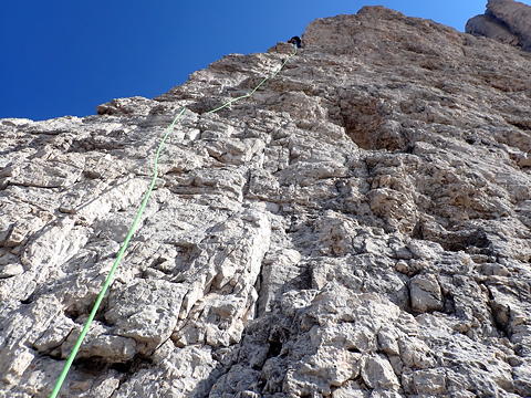 3ピッチ目は出だしでアレーテの左に入り、日陰になるとともにスリッピー。つるつるのその岩肌の滑りやすさに「やはり石灰岩はこうでなくては」と妙な感心をしながら登りました。それはともかく、このルートは大勢のクライマーを迎えているためか岩がおおむねしっかりと硬く、ルートファインディングの不安もなしに気持ちよく登れるのがいいところです。