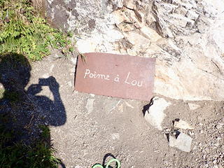 明瞭な踏み跡を辿り、フィックスロープのあるコーナーを回ってブレヴァンの東面から南面に移り、わずかの歩きで足元に「Poème à Lou」と味わいのある書体で書かれた金属製の看板が現れました。このルートが開拓されたのは2003年で、命名の由来は不明ですが、アポリネールの詩集『Poèmes à Lou』が参照されているものと思われます。ここから少し壁の方に登ったところに取付きの支点が用意されていますが、看板のある場所が安定したテラスになっているのでテオはここから登攀を開始することを選択しました。使用するロープは60mのシングル、この日はあらかじめの打合せに基づき全ピッチをテオがリードします。
