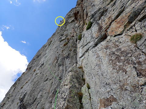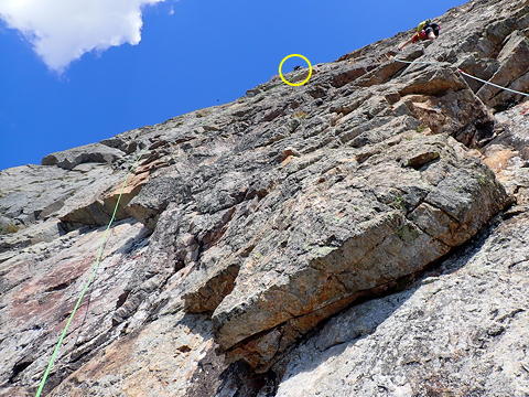 と表記あり。「3 pa」というのは「3手エイドでつなぐ」といった意味)は「よろしく」とこちらに声を掛けてから慎重にフリーで登っていきました。このパートを抜ければ6aのフェースで、このグレードなら自分でもフォローならなんとかなります。