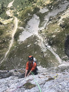 このピッチを終えて確保支点に達した時点で、自分の中では早くも白旗が上がっていましたが、そんなことはお構いなしにテオは「慎重にビレイしてくれ。自分にとってもイージーなグレードではないので」と言い残して次のピッチに向かって発進していきました。