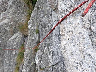 ガリーにはこのようにフィックスロープが張られており、これにクイックドローを掛けてハーネスとつないで渡れば簡単ですが、これを使わなければ6c+です。さすがにテオもここはフィックスロープを使っていましたが、続くワンポイント(トポには3 pa or 6b+