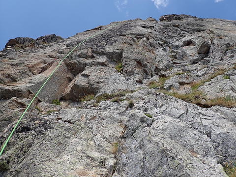 4ピッチ目(6a)、先ほどのピッチの確保支点から左上してピナクルの上に立ち、その左に落ちている狭いガリーを越えて左上するライン。