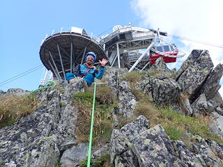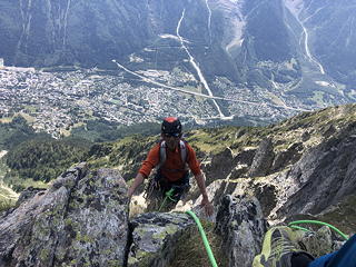 ぐいぐいと登ってトップアウトしたところはブレヴァンのロープウェイ駅の直下。背後にはシャモニーの町、そしてその上にモン・ブランの白銀の山頂が見えています。ここでテオと握手を交わし、シューズを履き替えて踏み跡を辿りロープウェイ駅に向かいました。