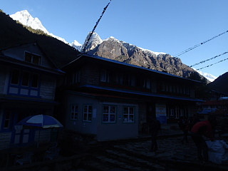 午前6時、昨夜の予告どおり寝起きのSpO2を測りに水木さんがやってきた後に、ネパール・スタッフが洗面器いっぱいのお湯(タトパニ)を持ってきてくれて、これで顔を洗ってさっぱりしました。外に出ると、宿の正面には澄み渡る空の下に雪をかぶった山。これを戸口に立って見上げていると、温厚そうな風貌の宿のご主人が流暢な日本語で「おお、雪が降りましたね!」と声を掛けてきました。