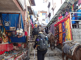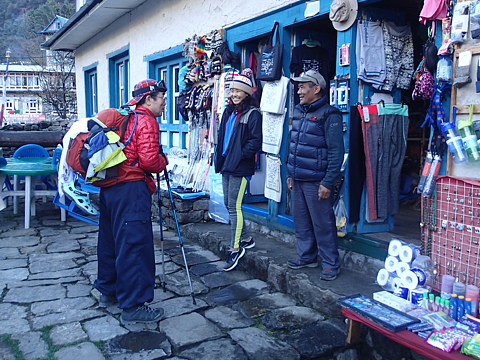 ナムチェバザールは、ボーテ・コシ側の山腹の高い位置に開けた大きなすり鉢状の地形の中に一つの町がすっぽり収まっており、寺院もあれば宿泊所もあり、その名のとおり土曜日にはマーケットが開かれます。このマーケットには低地から商人たちがやってきて半日商売して帰っていくのですが、チベットからの往来が中国の政策で禁じられたために、近年の市は低調なのだとバラサーブは言っていました。