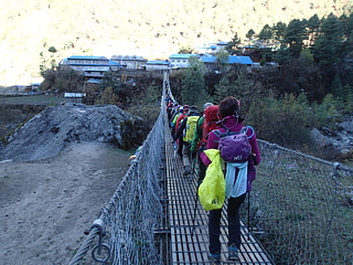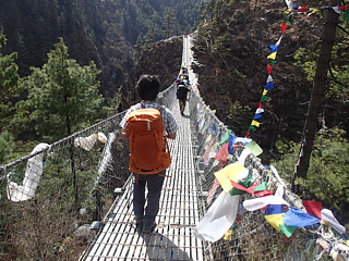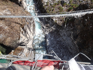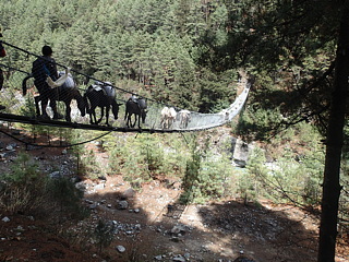 今日のトレッキングは、ドゥード・コシ(「コシ」は「川」の意)に掛かる吊り橋を左岸から右岸へと渡ることから始まりました。こうした吊り橋をこれから何度も渡ることになるのですが、いずれも金属でがっちり作られており、揺れはするものの安心感があります。それもそのはず、この吊り橋は荷物を目いっぱい背負ったロバやゾッキョ、ヤクの隊列が一度に渡ることもできる強靭さを備えているのです。