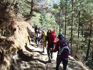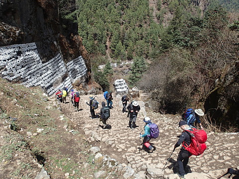 マニ石、チョルテン、荷を運ぶロバ、ネパールの国花であるシャクナゲ。路上にはいたるところに動物たちの糞。我々にとってはトレッキング道であるこのエベレスト街道も、元来はチベットとの交易路であり、この地方に住む人々の生活路でもあります。