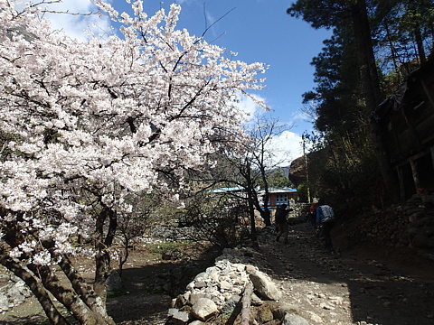 川を左岸に渡り返すと、ここに住んでいた日本人が植えたという見事な桜の木が満開の花を咲かせていました。そして彼方には霊峰クンビラ(5761m)が見えています。