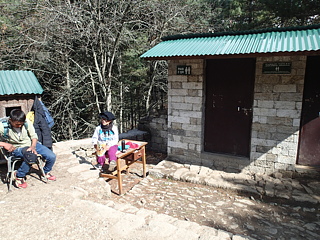 無事に橋を渡って少し上がったところにエベレストのビューポイントがありましたが、あいにくこのときのエベレスト方面は白い雲に覆われていて、エベレストを眺めることはできませんでした。ここには公衆トイレもあって、右のローカルスタイルは無料、左の西洋風は50ルピー。集金係はアラレちゃんみたいに大きなメガネをかけた可愛い女の子でした。