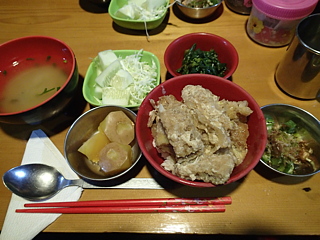 うれしいことに、ここではシャワーを使うことができました。少々お湯が細いものの、十分な温度のお湯で頭を洗い気分良し。ただし標高が3400mを越えているここでは、シャワーを浴びたら手早く衣服を身に着けないと風邪をひいてしまいます。また、この宿ではWi-Fiが500ルピーで無制限に使えますが、夕方から天気が悪くなったために(?)インターネットにつながらない、と宿の主人にすまなそうに言われました。そして、夕食はまさかのカツ丼、たくさんの小鉢に豊富な野菜、デザートにはリンゴがつきました。