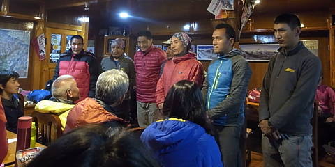 食後にはネパール・スタッフの紹介がありました。向かって左端の堂々たる体格の人物が、今回の隊のネパール側代表であるプラチリ・シェルパ。笑うと金歯がキラリと光ります。そして後に我々が「プラチリ団」と呼ぶことになるこの隊は、高所ガイド、キッチンスタッフ、ポーターからなり、写真の高所ガイドはいずれも8000m峰登頂経験を有する強力なメンバーたちです。特にプラチリの隣のパサン・タマンとその隣のチェパ・シェルパには、この後の旅の行程を通じてロブチェ隊のメンバーもずいぶんお世話になりました。また、キッチンスタッフのヘッドはバル・バハドゥール・ライですが、この職種区分はずっと固定であるわけではなく、例えばチェパがそうであったように、ポーターからキッチンスタッフへ、そしてガイドへと進む昇進ルートがあるようです。