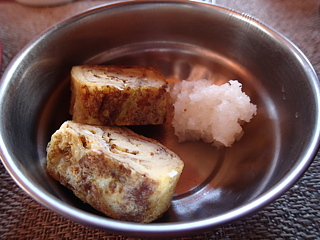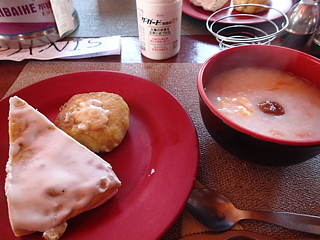 お粥とケーキ、だし巻き卵の組合せ。いずれもおいしくいただいて、締めは整腸剤「ザ・ガード」です。