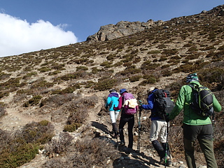 この日のプログラムは、昨日散歩で上がった尾根のさらに上の方にある山の途中まで、高度順応のために行うハイキングです。適当に隊列を組んで出発し、私が登り下りした道とは異なるラインで斜面を斜上して、ケルンのあるあたりに出ました。