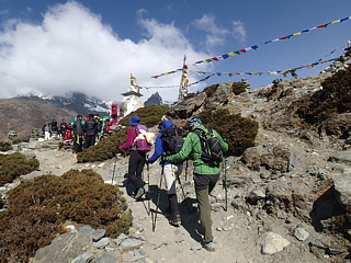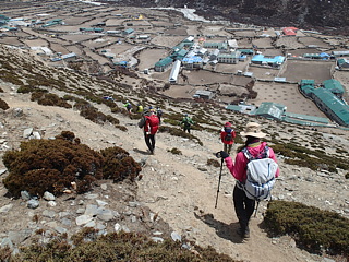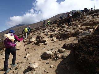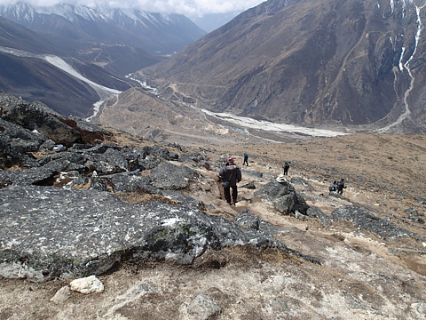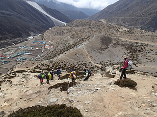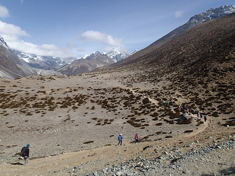 尾根の反対側には、クーンブ・コーラ左岸の斜面中腹の平坦地上につけられた道を行く大勢のトレッカーたちの姿がありました。明日はこの道を我々も行くのですが、この構図の中にすでにロブチェが見えていた(中央奥の雲がかかっているピークがそれ)ことに、このときは気付いていませんでした。