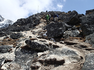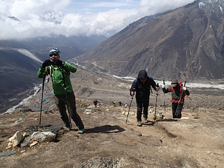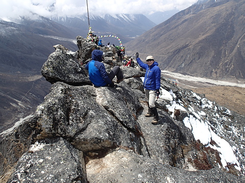ケルンからの尾根道はよく踏まれて歩きやすいもので、ディンボチェ中のトレッカーが登っているのではないかと思われるほど賑わっていました。我々もパサン・タマンに案内してもらって、ひろみさん、泡爺、私、タムさんの4人が先頭集団を形成しました。バラサーブが前にいるときは「お水飲んでる〜?」が定期的に飛んでくるのですが、我々だけのときは「あ!」が合言葉。ひろみさんか泡爺が「あ!」と叫んだら「あ!」と返して、ハイドレーションの水を飲むという寸法です。