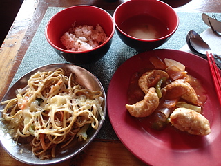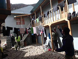 昼食後、洗濯物を掛けた張り綱を使ってロッジの中庭でバドミントン。バラサーブはこういう遊びも率先して取り組んで、隊員たちのモチベーションを維持してくれます。でもバラサーブ、こっちの方が息が切れるんですけど……。