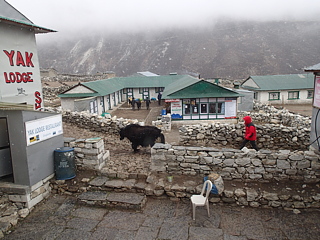 後は食堂でぼけっと時間つぶし。Yak Lodgeの前を通り過ぎていくヤクの数を「ヤクが1匹、ヤクが2匹……」と数えているうちにやがて雲が谷の上に蓋をするように降りてきて、時折雪も強く降るようになりました。そのせいかどうかWi-Fiが相変わらずつながらないのは困ったことですが、致し方ありません。ちなみに電子機器の充電は道中の宿ならどこでも可能ですが、ここでは携帯電話やカメラの充電が1時間300ルピー、モバイルバッテリーの充電は1時間500ルピーで、日が出ている間だけ充電可能です。一方、人間の方は立派なとんかつでエネルギー充填120%。ご飯はおいしく食べられるのですが、やはり高度の影響がお腹にきていて夜は頻繁にトイレに向かうことになりました。