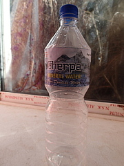 お腹のためにはミネラルウォーター。ネパール文字風のフォントが美しい「Sherpa」の文字の向こうに描かれているのはエベレストとローツェです。