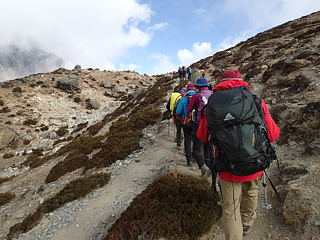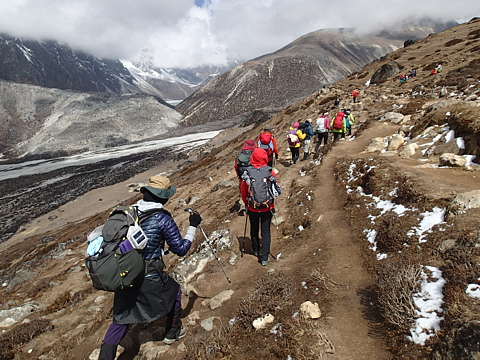 まずは昨日登った尾根を低い位置から大きく回り込むようにして越え、ついでクーンブ・コーラ左岸の高い位置を横に走るトレッキング道を歩きます。昨日も大勢のトレッカーがこの道を歩いていく姿を見ましたが、この日も前後左右に相当数の人々が同じ方向に向かっていました。