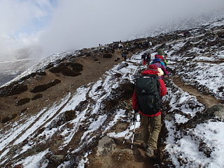 道自体は明瞭ですが、斜面には連日の雪が残っており、早い時刻から雲が降りてきて寒々しい歩き。身が引き締まる……というより、単純に寒い。