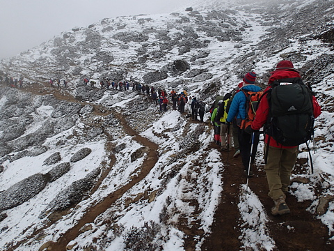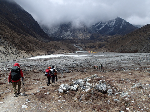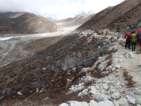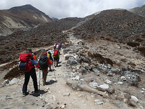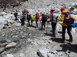 これまでに比べて(これでも)軽めの朝食の後には、このミネラルウォーターでビオフェルミン止瀉薬を飲み込みます。今日はいよいよ、前半のハイライトとなるロブチェ・イースト登攀に向けてロブチェBCへ移動する日ですが、やはりここまで来るとそれぞれに調子の良し悪しが出始めました。特に消耗していたのはトコちゃんで、このツアーに参加する前に登山をしたことがなく、旅行前検診の際に医師に強く勧められて六甲山に2回登った(だけ)という彼は、それでもカトマンズでは「カラ・パタールの予定だったが、エベレストに登りたくなった。地続きなんやから登れないことはないやろ?」と言い出してあまりの天然ぶりに周囲を唖然とさせていたのですが、昨日の高度順応のハイキングもケルンの位置に登ったところですでに目いっぱい。沙織さんのサポートを受けてさらにしばらく頑張ったものの、ここで体力を使い果たした感じです。そのためここでトコちゃんはいったん戦列から離れることになり、残りのメンバーでロッジを出発しました。