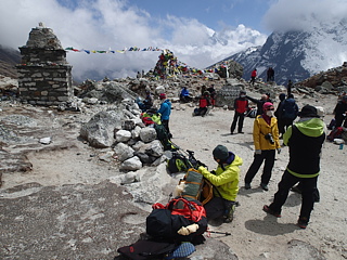 昼食のお弁当を使いながら歩き続けて、浅い川を飛び石で渡ったところがトレッカーたちの中継点となるトゥクラ、この川を上流(北北東)に進んで行き着く先がエベレストBCです。ここで体温を測ってみたところ36.0℃で、自分の平熱が35.5℃ですから確かに発熱しており、関節痛も感じられるので解熱剤を飲みました。単に苦しいとか疲れたというだけなら体力の回復を待てばよいのですが、風邪など他の隊員に影響を及ぼす可能性のある疾患の場合には隔離措置も考えなければならないので、事は重大です。一方、ディンボチェに残ったトコちゃんのために皆で寄書きを書いていたら、どうしたことかそこへトコちゃんが登場して皆びっくりしましたが、驚きはすぐに拍手に変わりました。