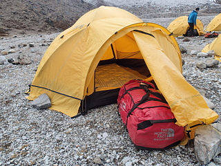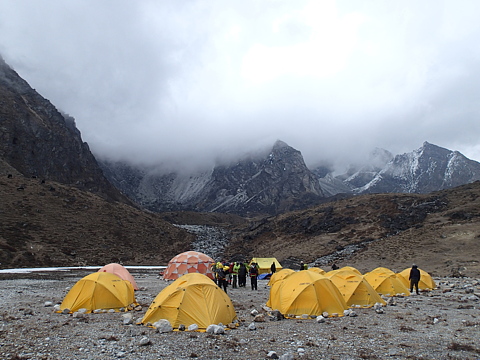中央のひときわ大きなまだらのテントが全員入れるダイニングテント、そしてその周囲の黄色いテントは寝泊まり用のテントです。後者は、エベレスト隊員とロブチェ隊のうち個室料金を払っている者は1人使用、残りの隊員は2人1組で使用します。