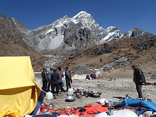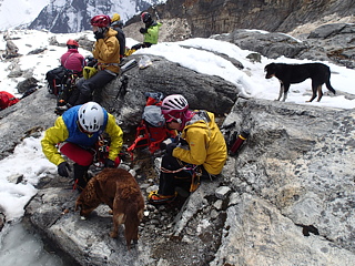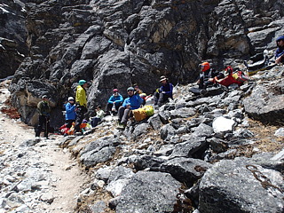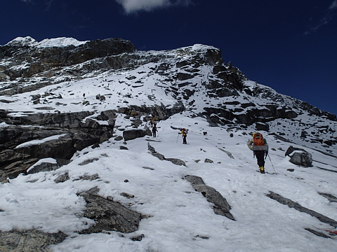 まずは高所用の靴とシュラフをポーターさんに預けて身軽な状態で昨日登った肩を目指すことになりますが、ここで予想外のトラブル発生。ちえさんが「片方のコンタクトレンズを落とした!」と大慌てになり、バラサーブに支援要請を出したのでした。いやー、さすがにそれは自己責任じゃないの?添乗員ならともかく山岳ガイドの仕事じゃないでしょう、などとおそらくその場の誰もが思ったことでしょうが、バラサーブは苦笑いしながら忍耐強くちえさんの話を聞いて、何とかしようとしてくれました。結局そのウン万円(?)のコンタクトレンズは見つからず、ちえさんも諦めて出発することになったのですが、後日カトマンズに戻ってからこのときの話になり、ちえさんにとってはコンタクトレンズも大事な登山道具の一つであったという説明を聞いて、なるほどそうだったのかと思った次第です。