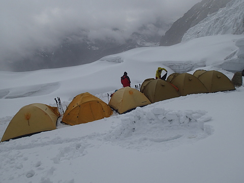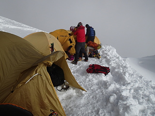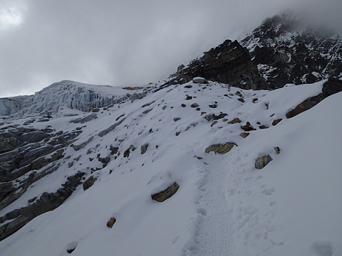 やっとこの日のゴールが見えてきました。雲がずいぶん降りてきていますが、ここまで来れば大丈夫。AG隊以外の隊のテントもちらほら見かけます。