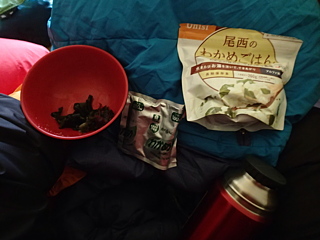 夕食は質素に、粉末わかめスープとフリーズドライのわかめごはん。この高度ではまともな食事は作れないし、そもそも喉も通らないという経験則に基づく設定ですが、わかめ尽くしはさすがに少し悲しいものがありました。せめて五目ごはんか赤飯だったらよかったのですが……。