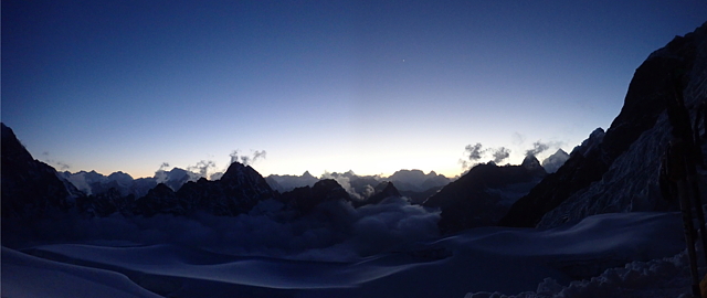 最後に大きく左へ回り込む尾根の上から、クーンブ氷河の全景を見渡すことができました。屏風のようなヌプツェの向こうにはチラリとエベレストも顔を覗かせています。