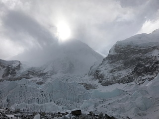 20分ほども上流に歩いたところで、流れを渡って左岸に渡りました。ここは、エベレストのノーマルルートの出だしに急角度で流れ落ちるアイスフォールへの入り口です。