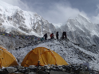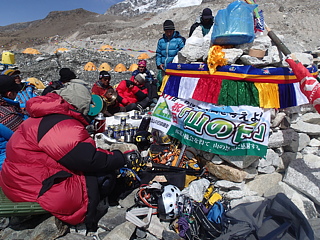 プジャとは祈願の儀式のことで、ここではもちろんエベレスト隊の登頂成功が祈られます。AG隊のキャンプのすぐ近くにある高台の上では、プラチリやチェパたちが朝早くから祭壇作りに勤しんでいました。