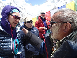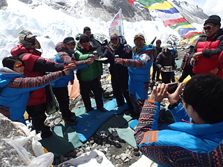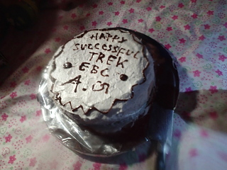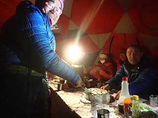エベレストBCへの無事到着を祝うケーキも登場しました。ケーキカットはトコちゃんとアッキーさんの共同作業です。